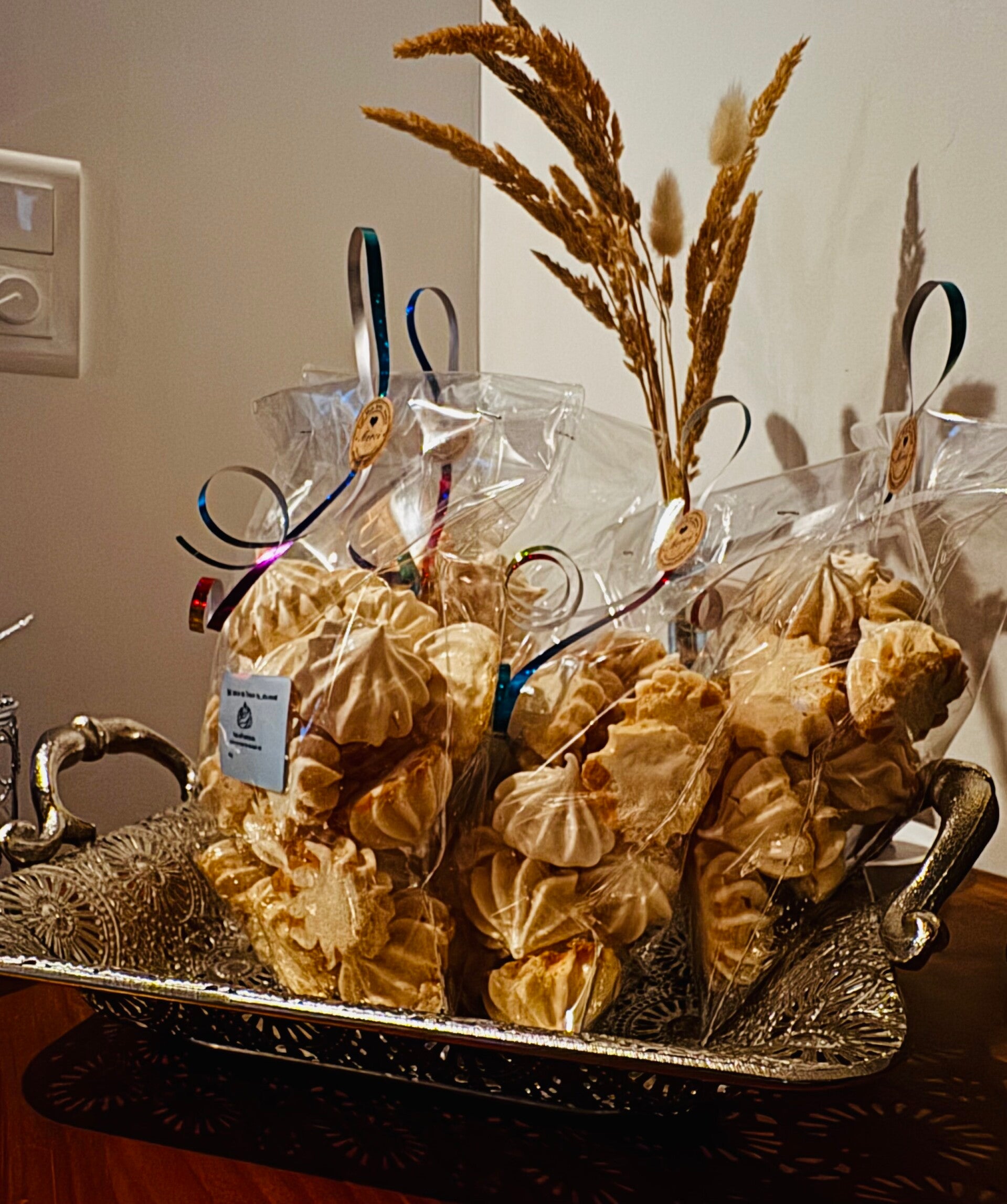 Les voilà 💖Les Gourmandises de Trésor 🐾 voici les meringues, natures ou parfumées ( framboises ou citron 🍋) .100 % Fait maison.
